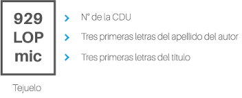 Los tres primeros dígitos de la CDU, asignada para ese ejemplar, además la información se completará, como regla general, con las tres primeras letras del apellido del autor en mayúscula y las tres primeras letras del título en minúscula ( se omiten artículos)